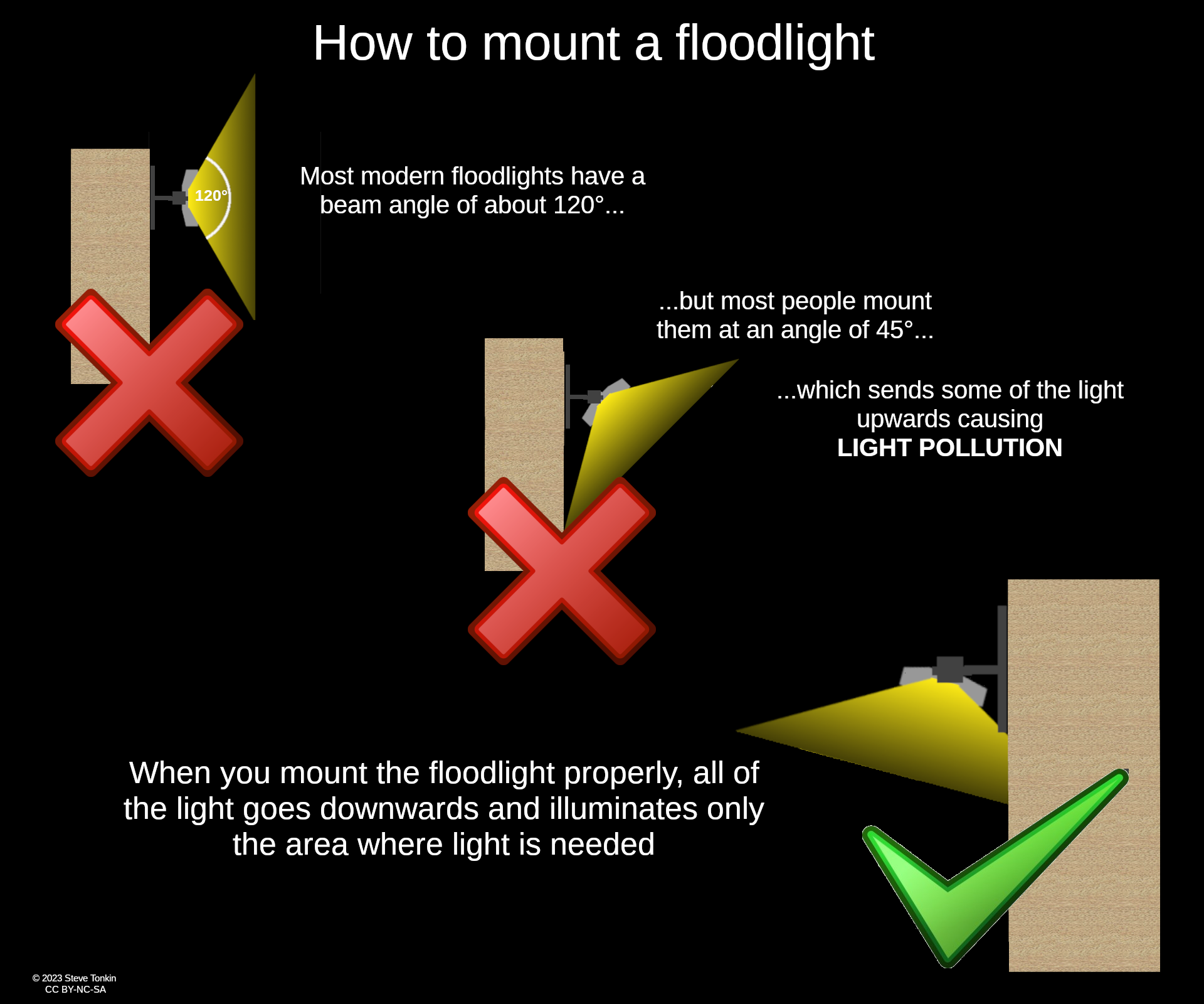 We often find that floodlights are incorrectly mounted, and all that is necessary is to adjust their angle so that no light is emitted above or near the horizontal.